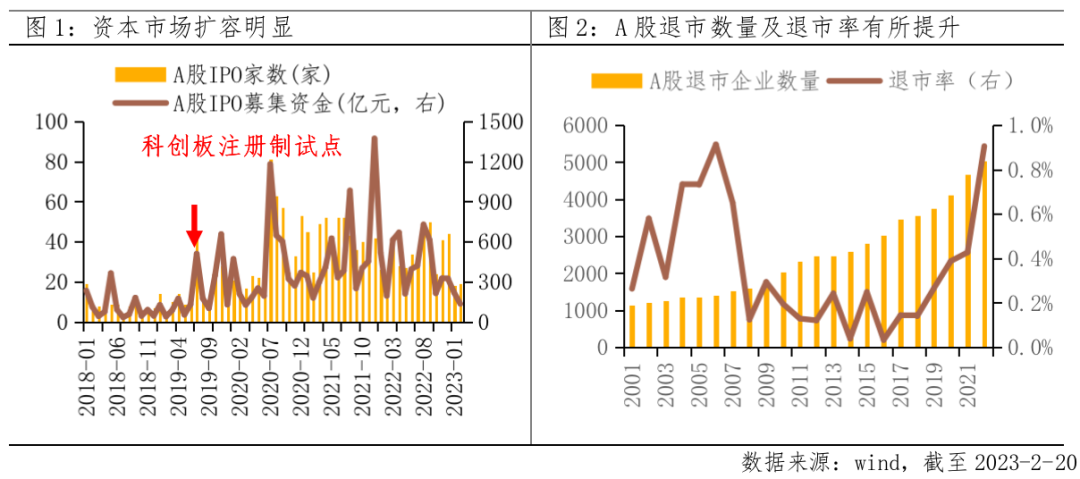 從歷史經驗看,2019年科創板注冊制試點以來成效明顯。一方面,資本市場擴容明顯,行業之變契合經濟轉型需求。A股IPO規模從2018年的103家升至2022年的416家,自2018年底至2023年2月20日A股上市公司共增加1513家,其中代表經濟轉型方向的電子、機械設備、醫療保健和計算機等成長行業成分股增加最多,分別增加231/217/185/137支。另一方面,A股退市數量及退市率有所提升,資本市場優勝劣汰功能逐步凸顯。2019-2022年A股退市企業數量占A股歷史退市企業總數的比例超40%,2022年退市率接近1%,雖與成熟資本市場仍有差距,但已實現逐年提升,A股“只進不出”的現象有所改善。