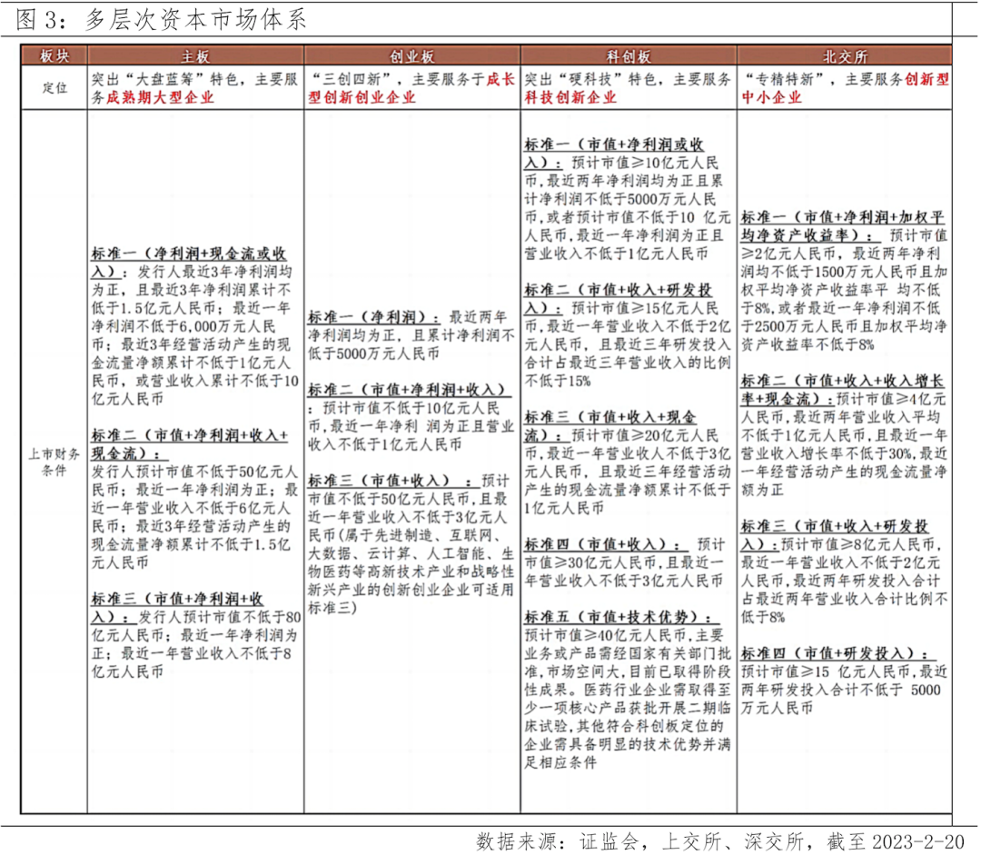 精簡優化發行上市條件是全面注冊制的核心,各板塊根據定位設置多元包容的上市條件:主板主要服務于成熟期大型企業,增設“財務+市值”上市條件,并取消不存在未彌補虧損、無形資產占比限制要求,上市標準由1套提升至3套,提升主板市場的包容性;創業板主要服務于成長型創新創業企業,將此前關于紅籌企業及特殊股權結構企業“最近一年凈利潤為正”的要求刪除,允許未盈利企業到創業板上市;科創板依然突出對“硬科技”企業的包容性;北交所與全國股轉系統主要服務創新型中小企業,探索更加契合其發展規律和成長特點的制度供給。