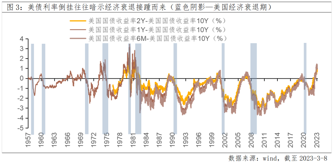 雖然美國1-2月經(jīng)濟數(shù)據(jù)普遍好于預期,但目前并不能證偽經(jīng)濟衰退。市場有觀點認為近期美國公布的就業(yè)、PMI、零售等數(shù)據(jù)均指向經(jīng)濟韌性,經(jīng)濟“軟著陸”的可能性增大。但從長短端美債利差來看,歷史上美債利率深度倒掛往往暗示著經(jīng)濟衰退或經(jīng)濟危機會接踵而來,當前美國國債1年期與10年期之間、以及2年期與10年期之間的利差均超過120BP,倒掛幅度創(chuàng)40年來新高,當前的經(jīng)濟韌性或因加息政策的滯后性尚未體現(xiàn),仍需警惕海外經(jīng)濟衰退風險。
