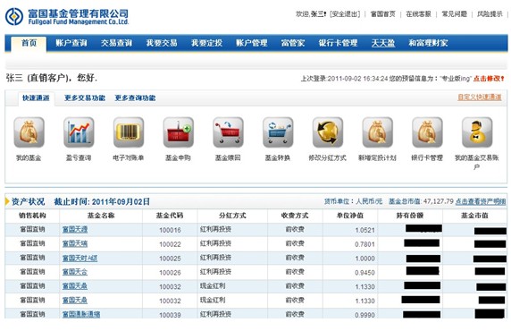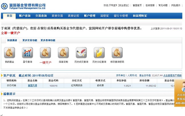 2、代銷客戶將看到以下界面。頁面頂端是功能菜單,顯示可供您操作的所有功能。在顯示區域中,默認顯示您可以進行操作的“快速通道”、您的資產狀況等信息。您可以通過“一鍵開戶”功能,完成代銷客戶轉直銷的操作,進而可以在富國網上進行基金的購買、定投等操作。
