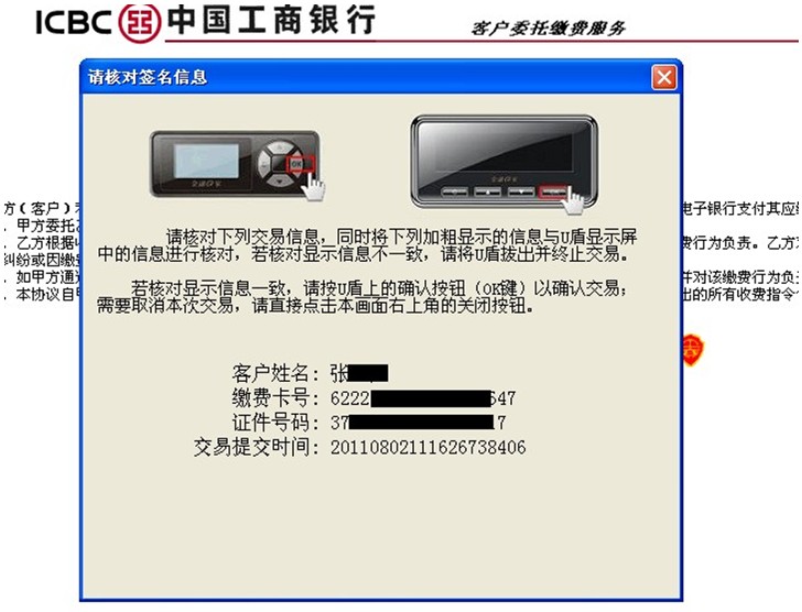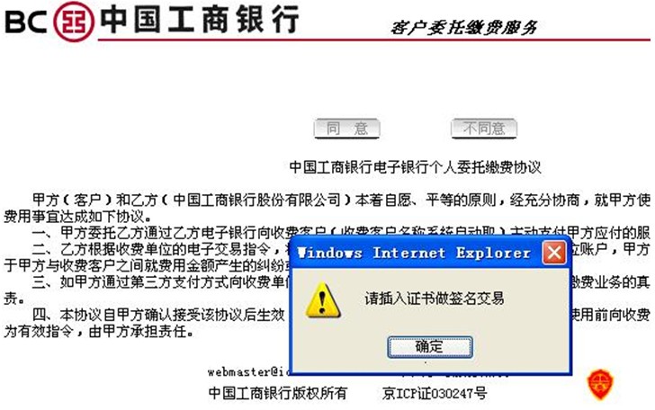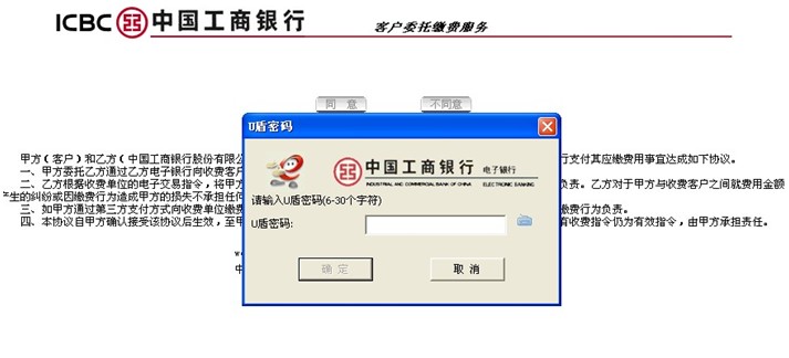 5、根據提示插入工行U盾,閱讀并簽署工行電子銀行個人委托繳費協議。