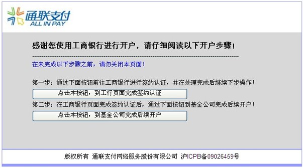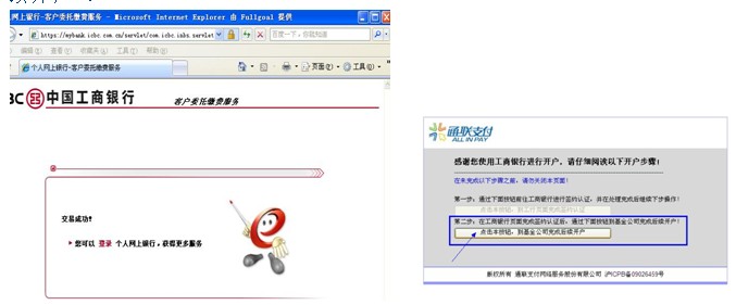 8、工行電子銀行個人委托繳費協議簽署成功,您將看到如下的頁面(左圖)。請您回到之前的通聯支付提示頁面(右圖),點擊第二步下面按鈕:“到基金公司完成后續開戶”。
