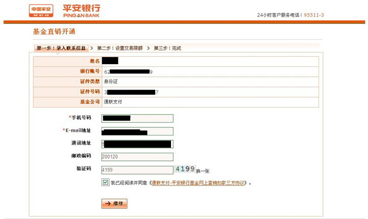 4、平安銀行簽約成功,請點擊“繼續”按鈕,返回富國頁面繼續開戶步驟。