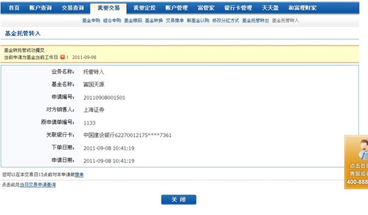 操作完成后,您基金托管轉入的申請已正式受理。您可以在2個工作日后登錄本交易系統,點擊“交易查詢—歷史成交查詢”來查看基金份額等確認情況。